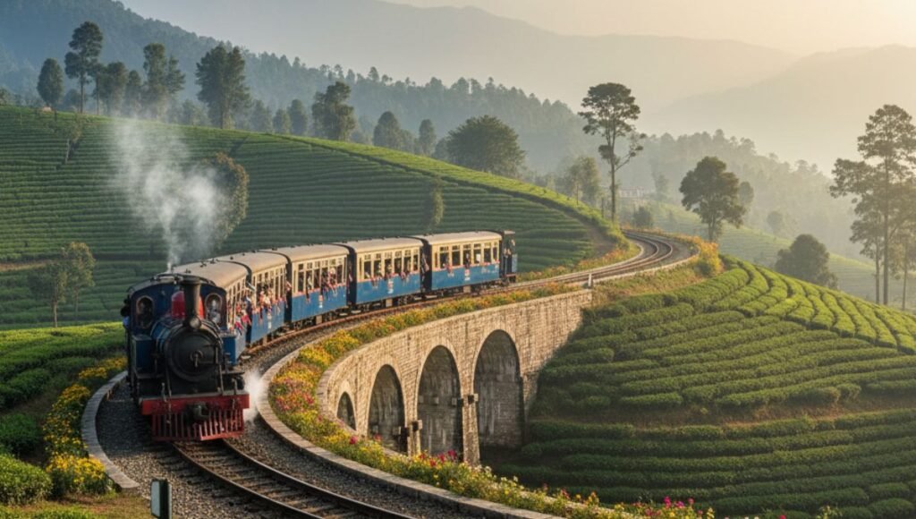 दार्जिलिंग हिमालयन रेल्वे, ज्याला प्रेमाने टॉय ट्रेन म्हणतात, ही युनेस्को वर्ल्ड हेरिटेज साईट आहे. या छोट्या निळ्या रंगाच्या ट्रेनमध्ये प्रवास करणे हा एक जादूच आहे. ट्रेन हळूहळू पर्वतांच्या वळणांवरून जाताना, तुम्ही खिडकीबाहेर पाहता तेव्हा दिसणारे दृश्य तुम्हाला मंत्रमुग्ध करून टाकते. दऱ्या, झरे, गावे आणि चहाच्या बागा – सगळं काही तुमच्या समोर एक चित्रपटाच्या स्क्रीनसारखं उलगडत जातं.