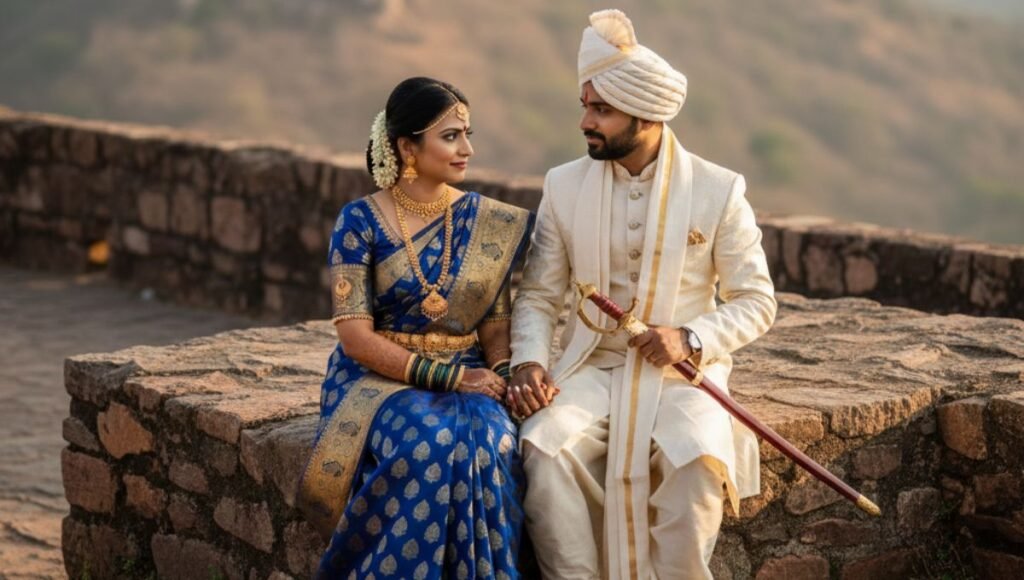 किल्ल्यांच्या रॉयल पार्श्वभूमीशी जुळणारा पोशाख निवडणे महत्त्वाचे आहे. पारंपारिक मराठी वेशभूषा जसे की नऊवारी साडी आणि फेटा-सदरा हे या लोकेशनशी अप्रतिम जुळतात. राजस्थानी शैलीतील लहंगा-चोळी किंवा शेरवानी हे देखील चांगले पर्याय आहेत. भडक रंग जसे की मरून, रॉयल ब्लू, गोल्डन किंवा डीप ग्रीन हे किल्ल्यांच्या जुन्या पिवळसर दगडांशी छान कॉन्ट्रास्ट तयार करतात.
