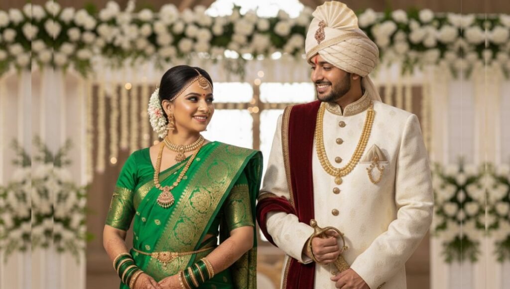 पारंपरिक मराठी लग्नासाठी नऊवारी साडी आणि फेटा हा क्लासिक कॉम्बिनेशन आहे. वधू पारंपरिक नऊवारी साडी घालू शकते ज्यावर सुवर्ण बॉर्डर असेल, आणि वर त्याच शेडचा फेटा आणि कुर्ता-धोतर घालू शकतो. यात मोठा नेकलेस, बाजूबंध, नथ आणि मुंडावळ्या यांसारखे पारंपरिक दागिने वधूला आणि त्याचप्रमाणे वराला मुंडेवळ्याचा हार आणि कानातले यांनी सजवले तर लूक पूर्ण होतो.