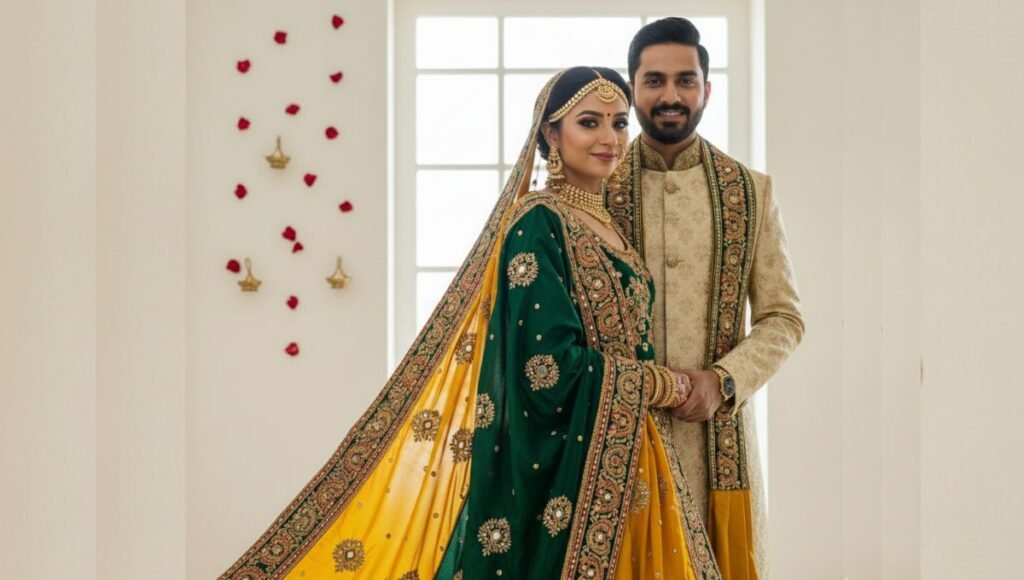 हळदीच्या कार्यक्रमासाठी पिवळा रंग पारंपरिक असला तरी, आता अनेक जोडपी पीच, ऑरेंज किंवा पेस्टेल यलो असे रंग पसंत करतात. या कार्यक्रमासाठी लाइटवेट फॅब्रिकची आउटफिट आरामदायक असतात. मुख्य लग्नाच्या कार्यक्रमासाठी तुम्ही हेवी एम्ब्रॉयडरी आणि रिच फॅब्रिक निवडू शकता, जेथे वधूचा लहंगा किंवा साडी आणि वराचा शेरवानी यांमध्ये सुंदर कोऑर्डिनेशन असावे. रिसेप्शनसाठी आधुनिक आणि ट्रेंडी लूक जसे की गाऊन आणि टक्सिडो किंवा अॅनारकली आणि नेहरू जॅकेट अप्रतिम ठरू शकतात.